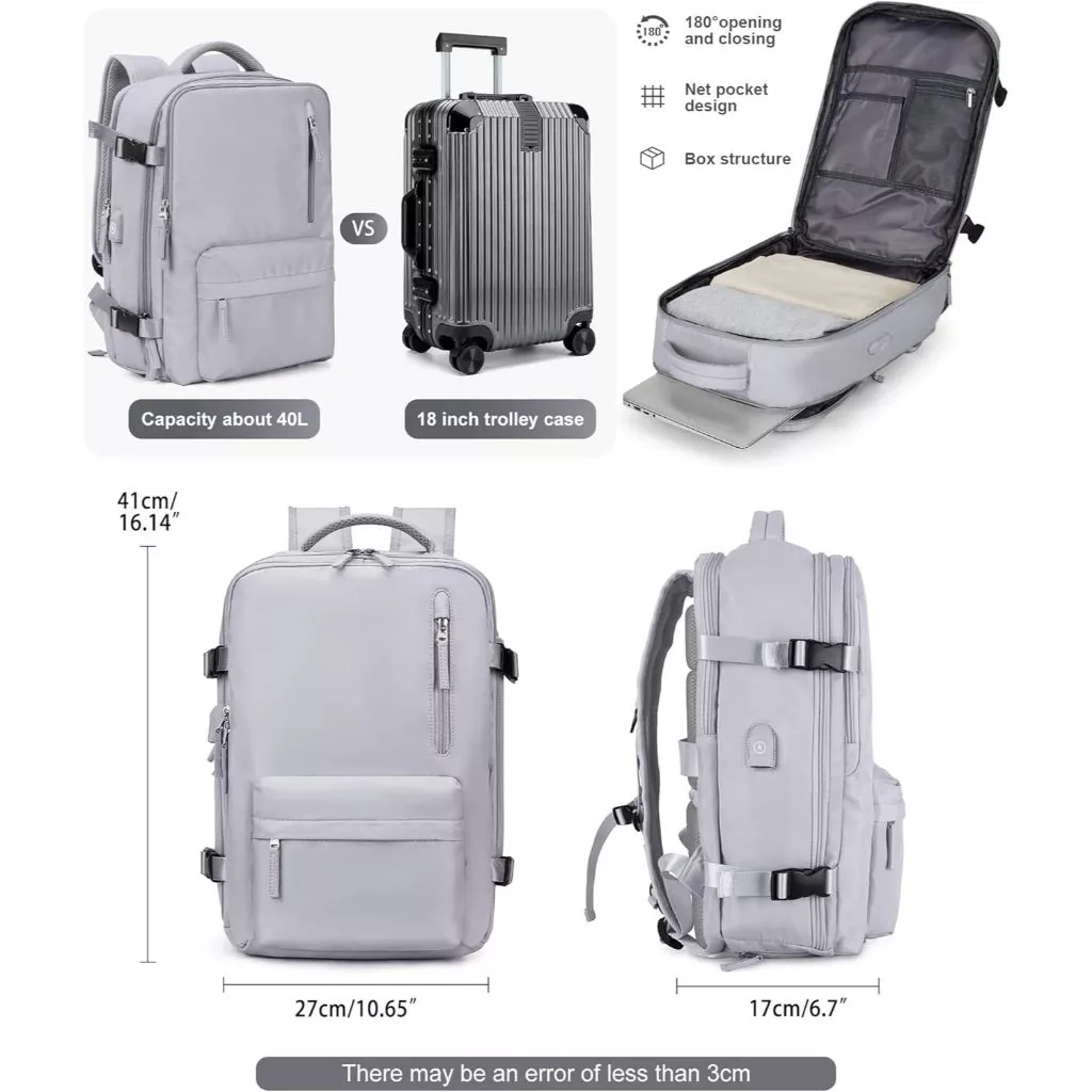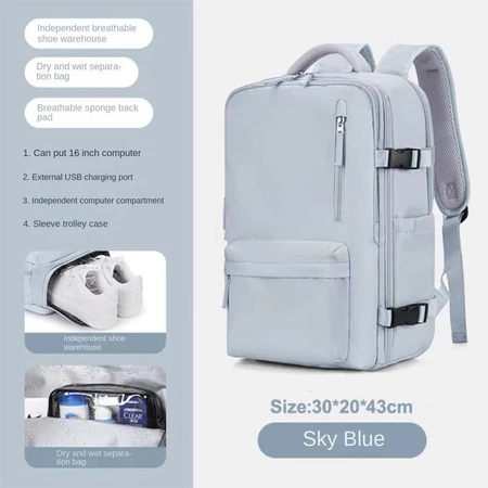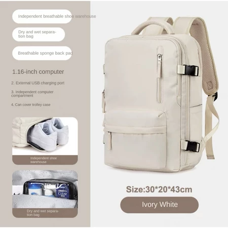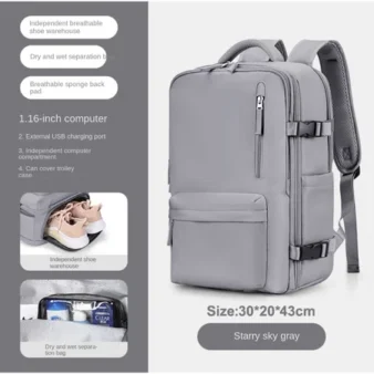 Features: Wet and dry separation bag, independent shoe position, USB interface, constant temperature side bag, breathable sponge back pad, side bag buckle, independent computer compartment